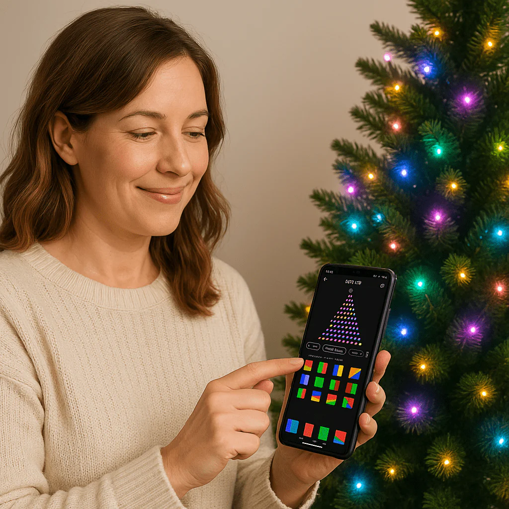 Featuring built-in LED lights that you can customize effortlessly through a smartphone app, this tree lets you choose colours, brightness, and lighting effects to match your festive mood. Designed for convenience and style, the tree comes pre-lit and easy to assemble, making holiday setup a breeze. The app gives you full control right at your fingertips.